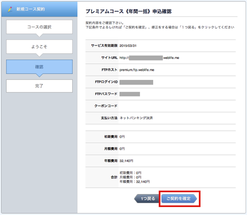 コースの契約内容を確認し問題なければ、【ご契約を確定】をクリックします。
