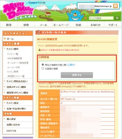 ※WHOIS情報を代理公開からご自身の情報公開へ切替えた後、再び代理公開に戻すと、ドメイン発行会社様によっては料金が発生する場合があります。