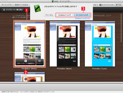 カテゴリーを選んだら、テンプレートを選択します。1つのカテゴリーには色合いの異なるバリエーションが数種類用意されていますのでクリックし[1]、〈作成〉をクリックします[2]。サイトフォルダを作成するダイアログが表示されたら〈ローカルフォルダ〉または〈Dropboxフォルダ〉を選択します。