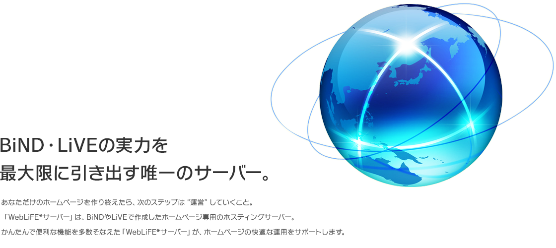 誰でも手軽に始められるベーシックコー ス。WebLiFE*サーバーで利用できるさまざまな機能の中から、ホームページの運営に必要な機能を厳選した、もっともシンプルなコースです。しかも、BiND本体をお持ちの方は最大2年間月額料金[1,027円(税込)]が無料に!