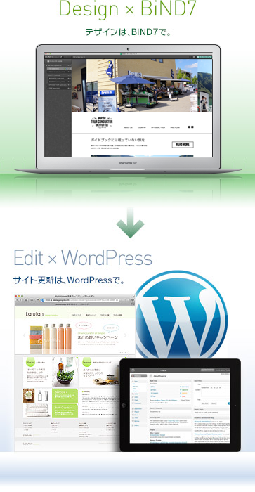 BiND for WordPressを使えば、BiNDがインストールされていないPCや、スマホ、タブレット端末からも更新 OK!ネットで管理画面にログインできれば更新可能だから、デバイスを選ばず、場所が離れた仲間同士でも更新できます。