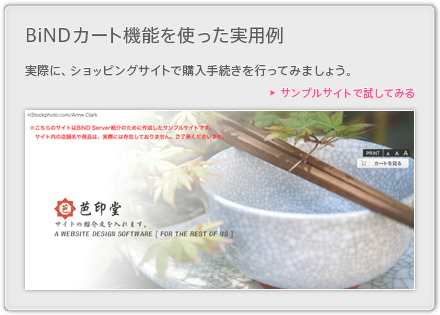 でも、WebLiFE*サーバーなら簡単に本格的なショッピングサイトを始められます。それを可能にしたのが、BiND本体と完全に連携したショッピングカートを備えた、「BiNDカート機能」です(※1)。